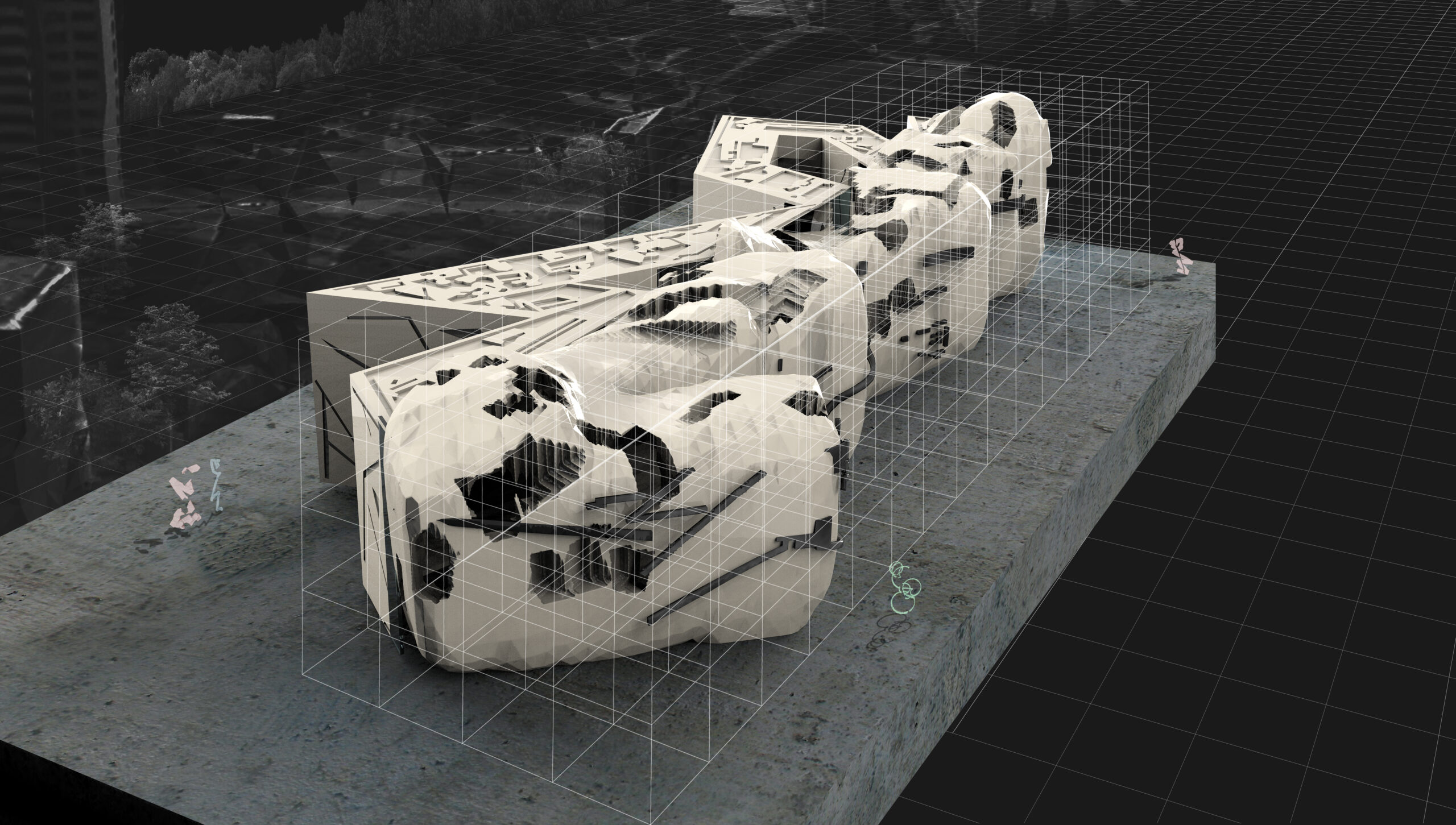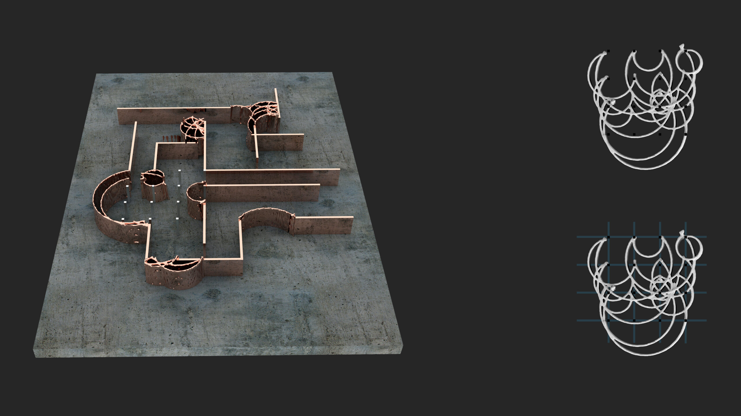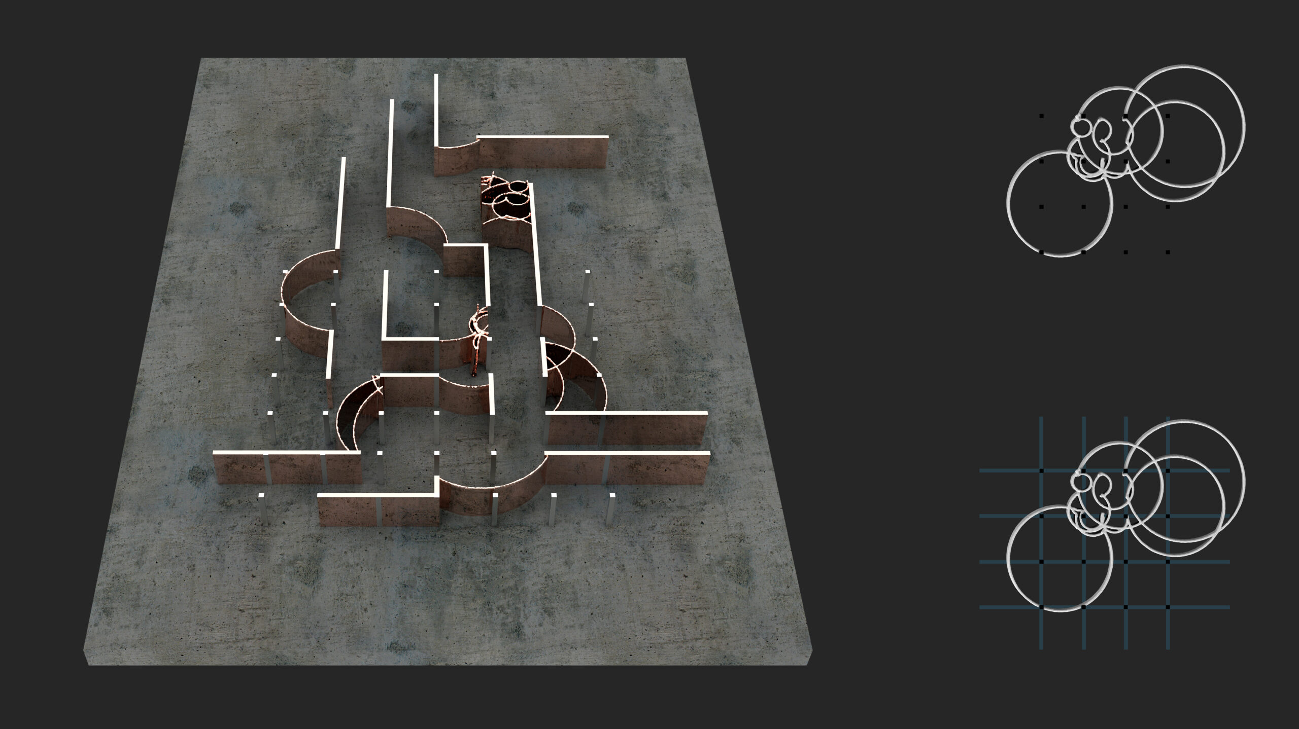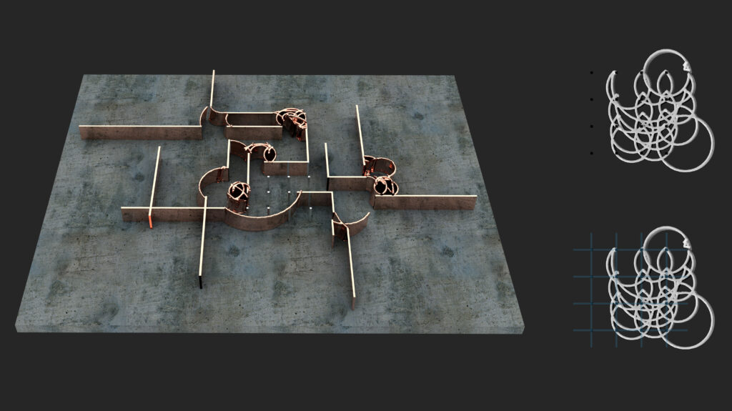 Triggering the spots on a grid that are presented as columns, to make the robot follow through its circular movement, these sets of architectural objects were created: